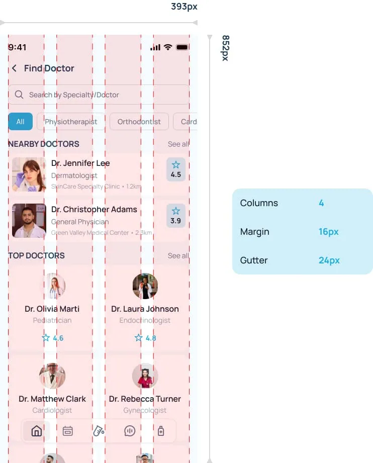 To ensure visual consistency, alignment, and scalability across the patient mobile app, Medo Nexa follows a structured mobile grid system optimized for modern smartphone screens. The layout is based on a 4-column grid with 16px margins and 24px gutters, providing a balanced rhythm between content and white space. This grid system allows flexible placement of cards, lists, and navigation elements while maintaining clear hierarchy and readability. By using a consistent grid foundation, the interface remains clean, predictable, and easy to navigate across all screen sizes.