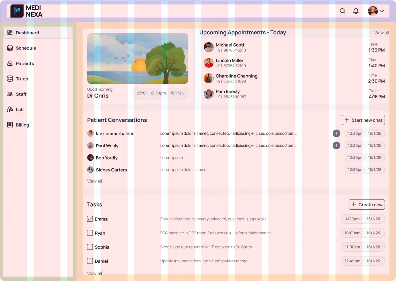 The Medo Nexa web admin dashboard is designed as the central command center for clinics and healthcare administrators. It provides a real-time overview of daily operations, including upcoming appointments, patient conversations, and staff tasks. With quick access to scheduling, patient records, lab management, and billing, the dashboard enables clinic teams to manage workflows efficiently and make informed decisions faster. The interface is built for clarity and productivity, ensuring that critical information is always visible and actionable.