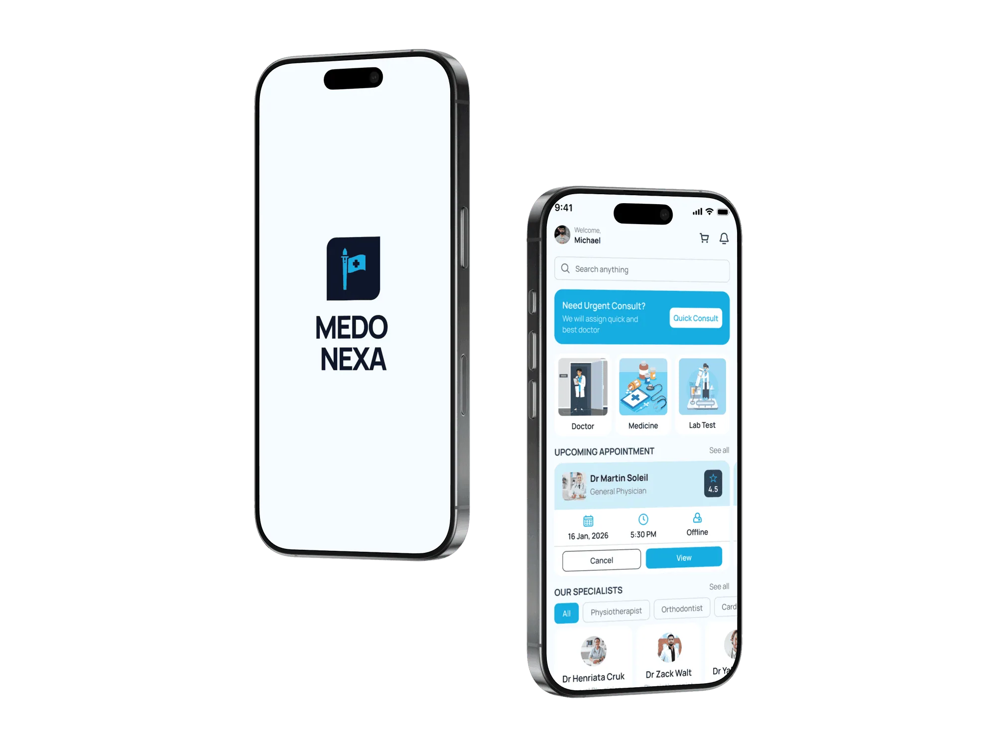 The Medo Nexa homepage is designed as a simple and powerful healthcare hub for patients. It provides instant access to essential services such as doctor consultations, medicine ordering, and lab tests, along with a clear view of upcoming appointments. With quick actions, smart search, and personalized recommendations, the homepage ensures that users can manage their healthcare needs effortlessly in just a few taps.